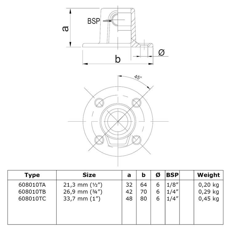 Diese Eigenschaft macht den Typ 10T zur idealen Lösung, wenn Sie Konstruktionen an Wänden oder Böden positionieren müssen, bei denen das Rohr weiterlaufen soll. Dank der vier Befestigungslöcher lässt sich der Flansch sicher und fest auf dem Untergrund verschrauben.