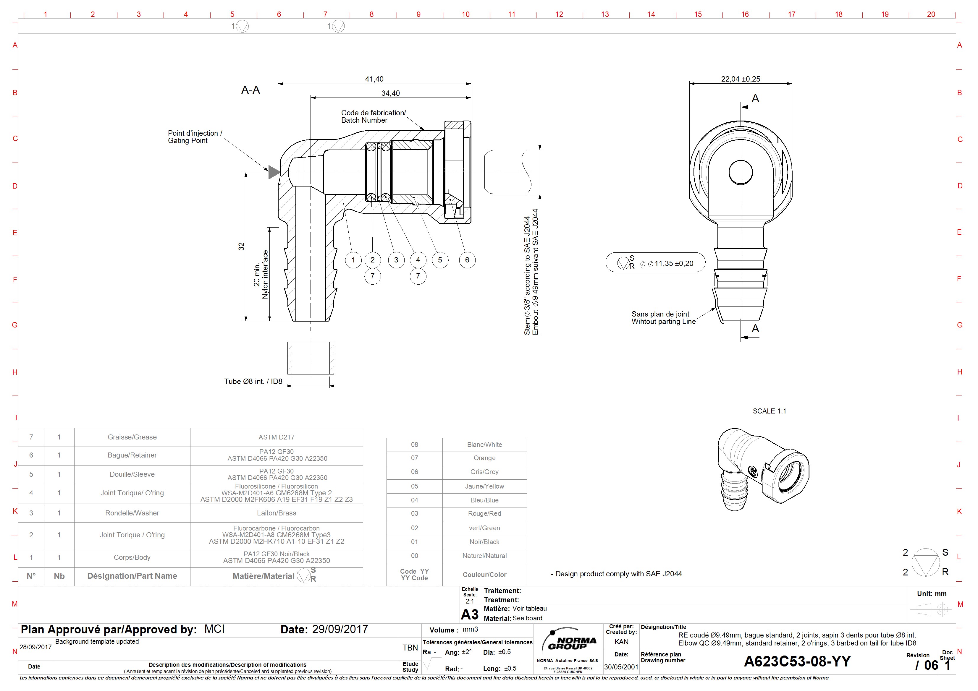 Die Autoline SAE J2044 Steckverbindung NW 3/8" mit 9,8 mm Schlauchanschluss A623C53-08M04 hat eine Nennweite von NW 3/8" und einem Schlauchanschluss für 9,8 mm Schlauchinnendurchmesser. Der A623C53-08M04 kann mit einem SAE-Stutzen (J2044) mit einem Außendurchmesser von 9,49 mm verbunden werden. Im Inneren des Steckverbinder befinden sich zwei spezielle Dichtringe aus FKM und FVMQ.